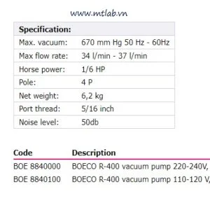 Thông số kỹ thuật Bơm chân không R-400: