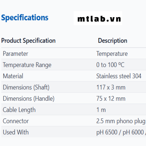 - Đầu dò đo nhiệt độ EC62019 Eutech làm bằng thép không gỉ 304, dải đo 0-100°C, thân đầu dò dài 117 mm (đường kính 3 mm), tay cầm 75×12 mm, cáp dài 1m, đầu nối phono 2.5 mm
