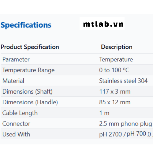 - Đầu dò đo nhiệt độ PH5TEMB01P Eutech làm bằng thép không gỉ 304, dải đo 0-100°C, thân đầu dò dài 117 mm (đường kính 3 mm), tay cầm 85×12 mm, cáp dài 1m, đầu nối phono 2.5 mm