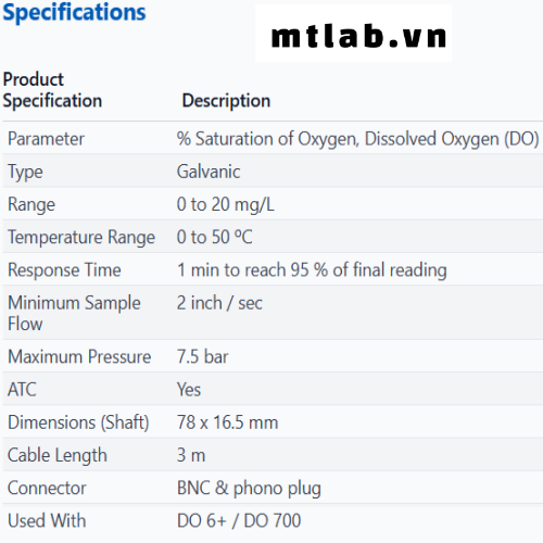 Thông số kỹ thuật Đầu dò Oxy hòa tan ECDO6HANDY3M Eutech: