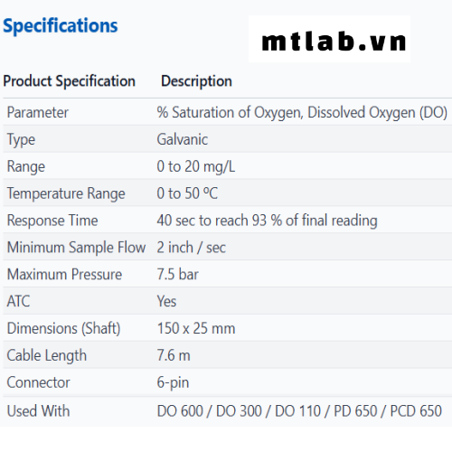 - Đầu dò đo oxy hòa tan ECDO6HANDY8M Eutech với cáp dài 7.6m, đầu nối 6-pin, dải đo 0-20 mg/L, nhiệt độ 0-50°C, thời gian đáp ứng 40 giây đạt 93%