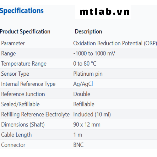 - Cảm biến bạch kim (Platinum): Cảm biến chốt bạch kim đáng tin cậy cho các phép đo ORP chính xác.