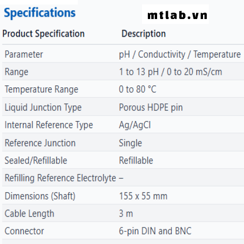 • Đầu dò pH ECCOMBI03BW Eutech tích hợp pH (1-13), độ dẫn điện (0-20 mS/cm) và nhiệt độ (0-80°C) trong một đầu dò
