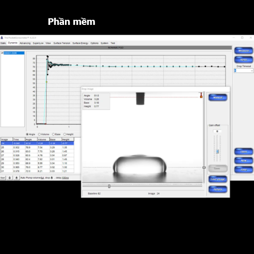 PGX+ đo cả góc tiếp xúc tĩnh và động. Gần như mỗi 1/100 giây sẽ chụp một ảnh để ghi nhận sự thay đổi của góc tiếp xúc.